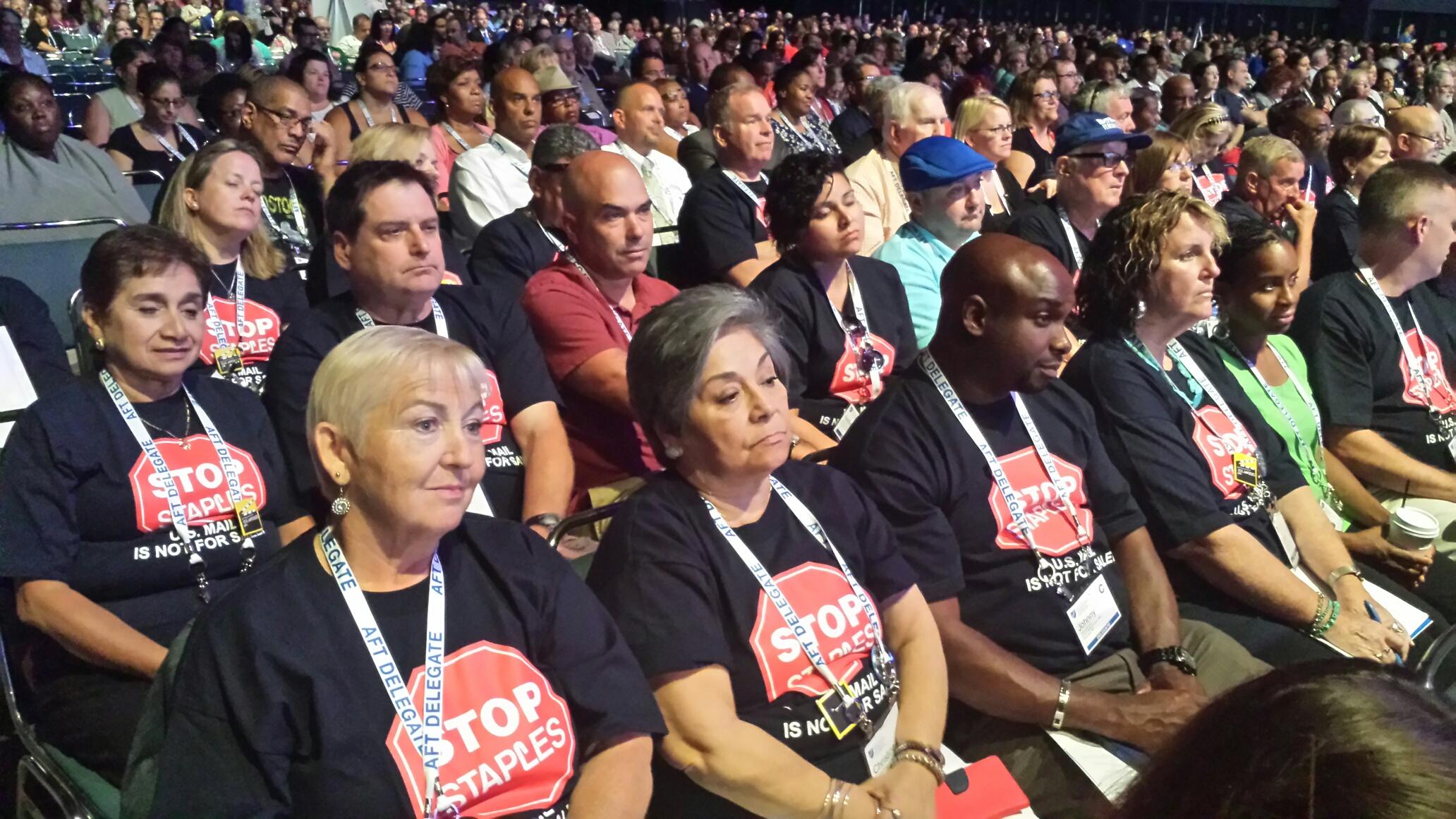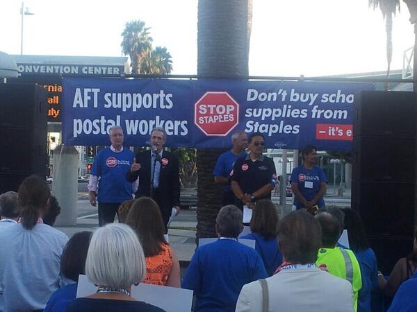 The AFT has also passed a resolution in support of APWU’s boycott against Staples Inc. It resolves “that members of the AFT, along with friends, colleagues and family members, are urged to no longer shop at Staples stores until further notice.” Read the resolution here.