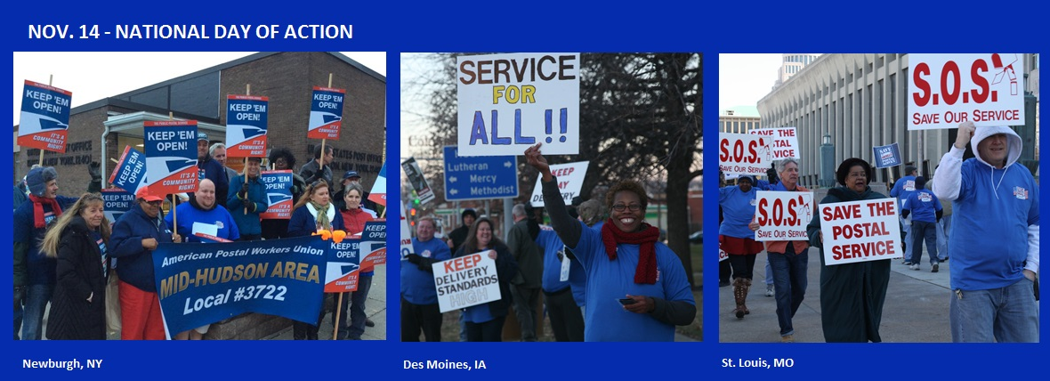 APWU members held more than 150 protests on Nov. 14, with events in all 50 states, to send a message to Postmaster General Patrick Donahoe and the USPS Board of Governors: Stop Delaying America’s Mail!
