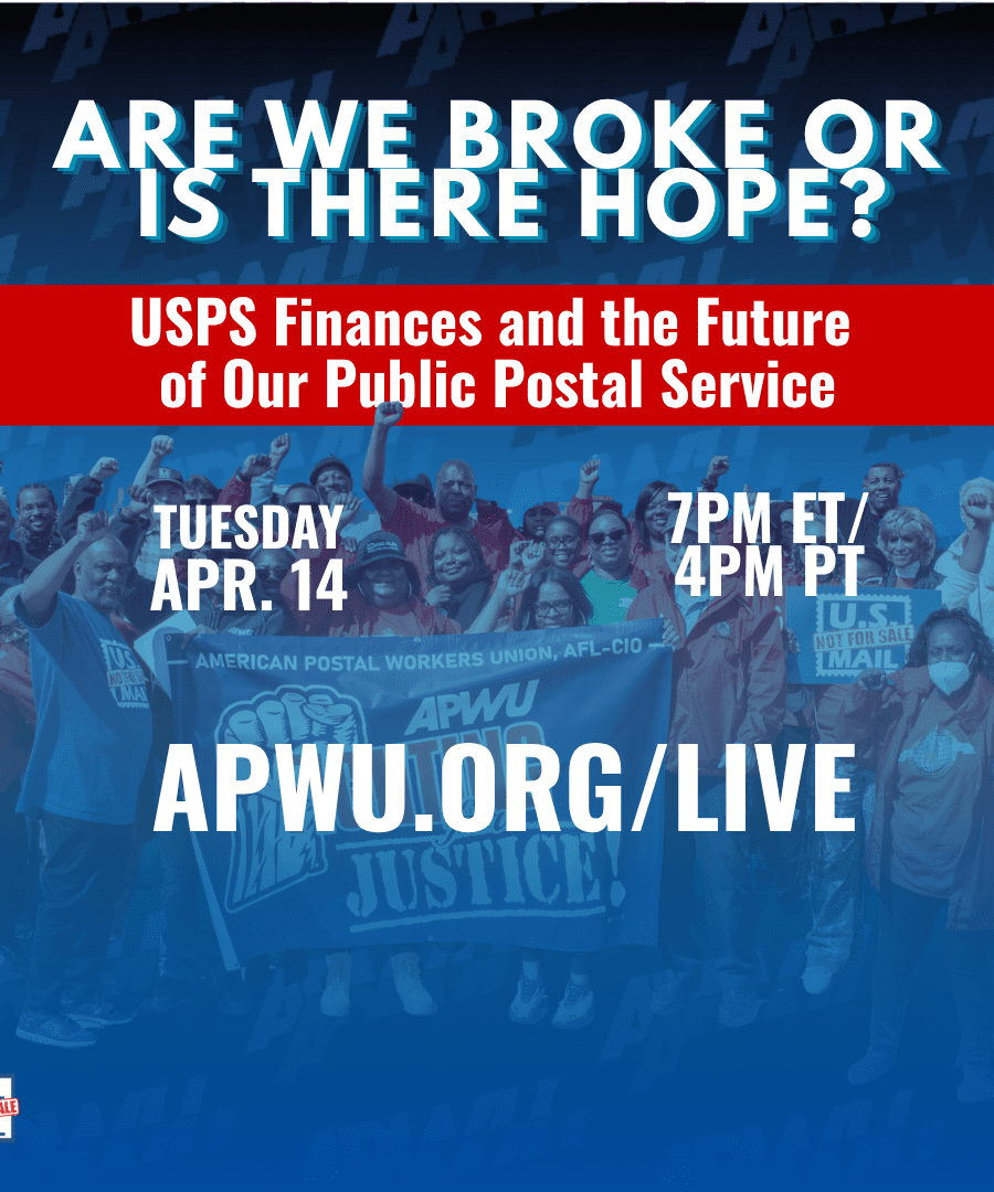 Join APWU President Jonathan Smith LIVE tonight April 14 at 7 p.m. ET/4 p.m. PT to learn about the USPS’s financial situation and what the future holds for our public Postal Service.
