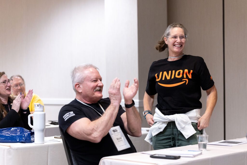 After some input from APWU’s lead private sector organizer, Rich Shelley, who spoke about probing unorganized workers to gather their interest in potentially organizing, and a demonstration by private sector organizer Lori Cash and Amazon worker Lauri Masterson on how to have an organizing conversation, attendees broke into groups for an exercise on writing an organizing conversation.