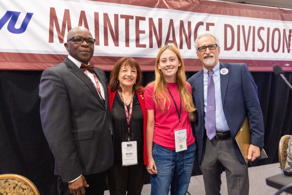 Before officer reports began, Director Balogun acknowledged all the Maintenance Craft Directors under 30, and celebrated Abby Moyer of the Des Moines Area Local as the youngest Maintenance Director at just 22 years old. She was brought up for a photo opportunity with Dimondstein and Balogun.