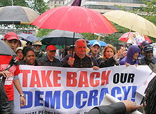 Chanting “Bust Up Big Banks, Bail Out — No Thanks!” rally participants marched down K Street to demand an end to corporate bailouts, and to spread the message, “It’s time to take back our democracy from big bank lobbyists!” They briefly stopped traffic at the intersection of K and 14th streets, NW during the busy lunch hour.