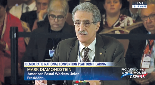 APWU President Mark Dimondstein addressed the Democratic National Committee (DNC) Platform Committee on June 9, where he gave an impassioned defense of the public Postal Service and urged the committee to adopt specific pro-postal and pro-worker planks.