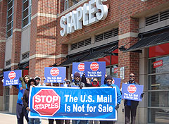 When postal workers protest outside Staples stores, the public gets the message, organizers report. Many Staples customers assume the postal counters are run by USPS employees, but after learning the truth, they often say they will take their business elsewhere.