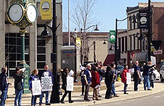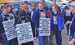 Approximately 70 APWU members and supporters lined the streets in Belleville, IL on March 7 to ask passersby not to patronize a newly opened postal retail operation at Ben Franklin’s Crafts & Floral store. The store began offering postal services as a Contract Postal Unit (CPU) in February.