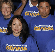 APWU members model the “Obama attire” that delegates are encouraged to wear on Wednesday. These shirts are available at the COPA Booth in Exhibit Hall. The contribution of $10 will benefit the union’s political action fund.