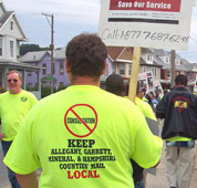 The local mailed out letters to more than 300 area businesses, which generated a large amount of mail to former Sen. Paul Sarbanes (D). Sarbanes then met with USPS officials to underscore the public’s concerns. Also last summer, at the Allegany County Fair, APWU members passed out information from the AFL-CIO booth and debuted T-shirts with the traditional “No” circle/slash icon over the word “Consolidation.” T-shirt wearing groups also made appearances at popular “Friday After Five” gatherings at an area mall.