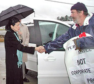 More than 100 APWU members picketing in a steady, cold rain greeted senators Susan Collins (R) and Olympia Snowe (R), who had planned to help mark the opening of the state-of-the-art facility. When union protestors told them about severe understaffing at the new facility, the negative effect the lack of personnel would have on service, and shabby treatment of the area’s postal workers, the senators decided to stay away from the ceremonies, opting instead to visit with APWU protesters and answer media inquiries.