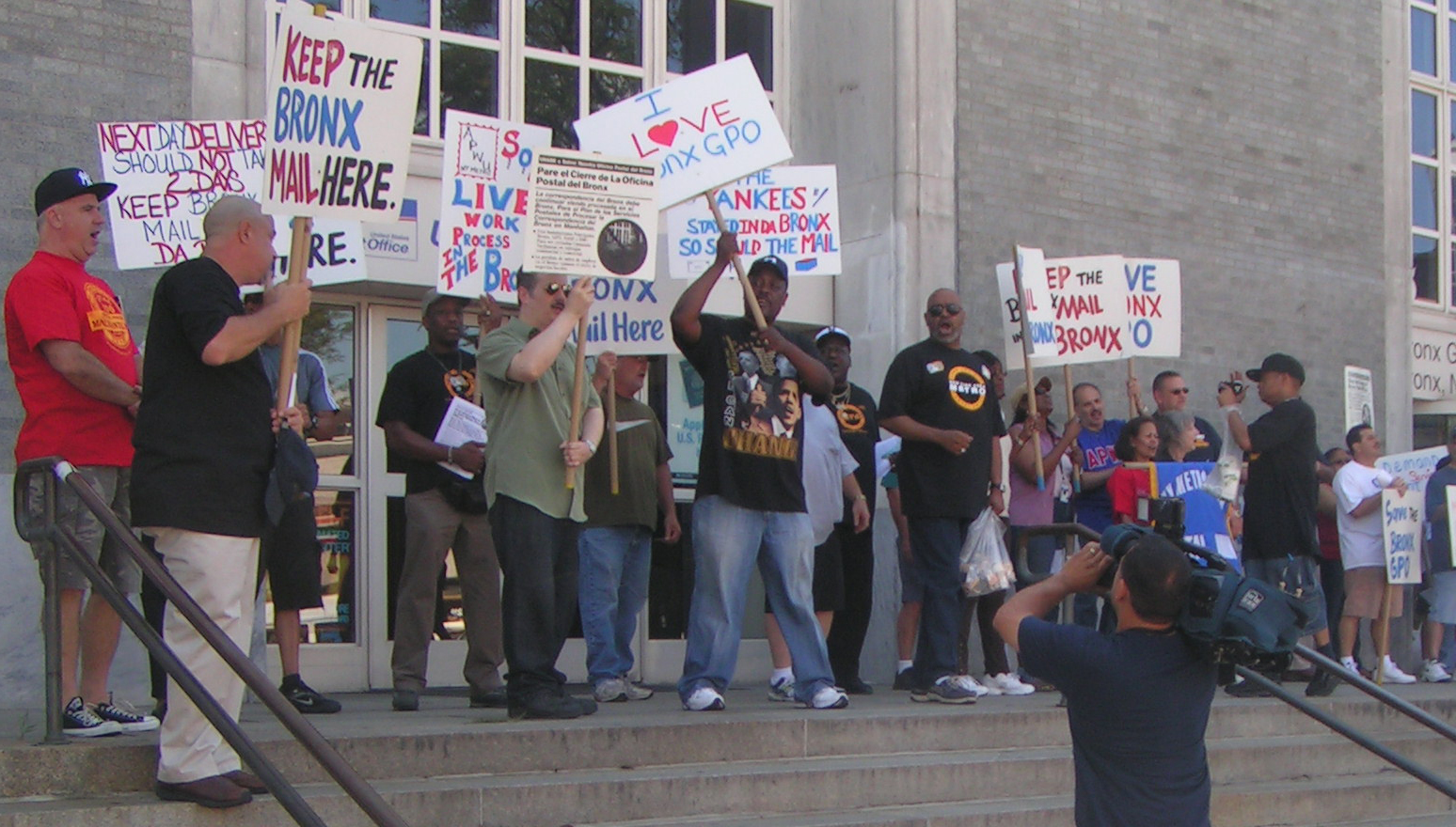 In New York City, APWU members and community activists have been contesting the sale of the Bronx GPO. The facility is an architectural masterpiece built in 1935 that features priceless murals and other works of art. The New York Metro Area Local has been fighting to keep the facility open since December 2005, when it was targeted for consolidation. The Postal Service moved the facility’s processing and distribution operations to Manhattan in 2011.