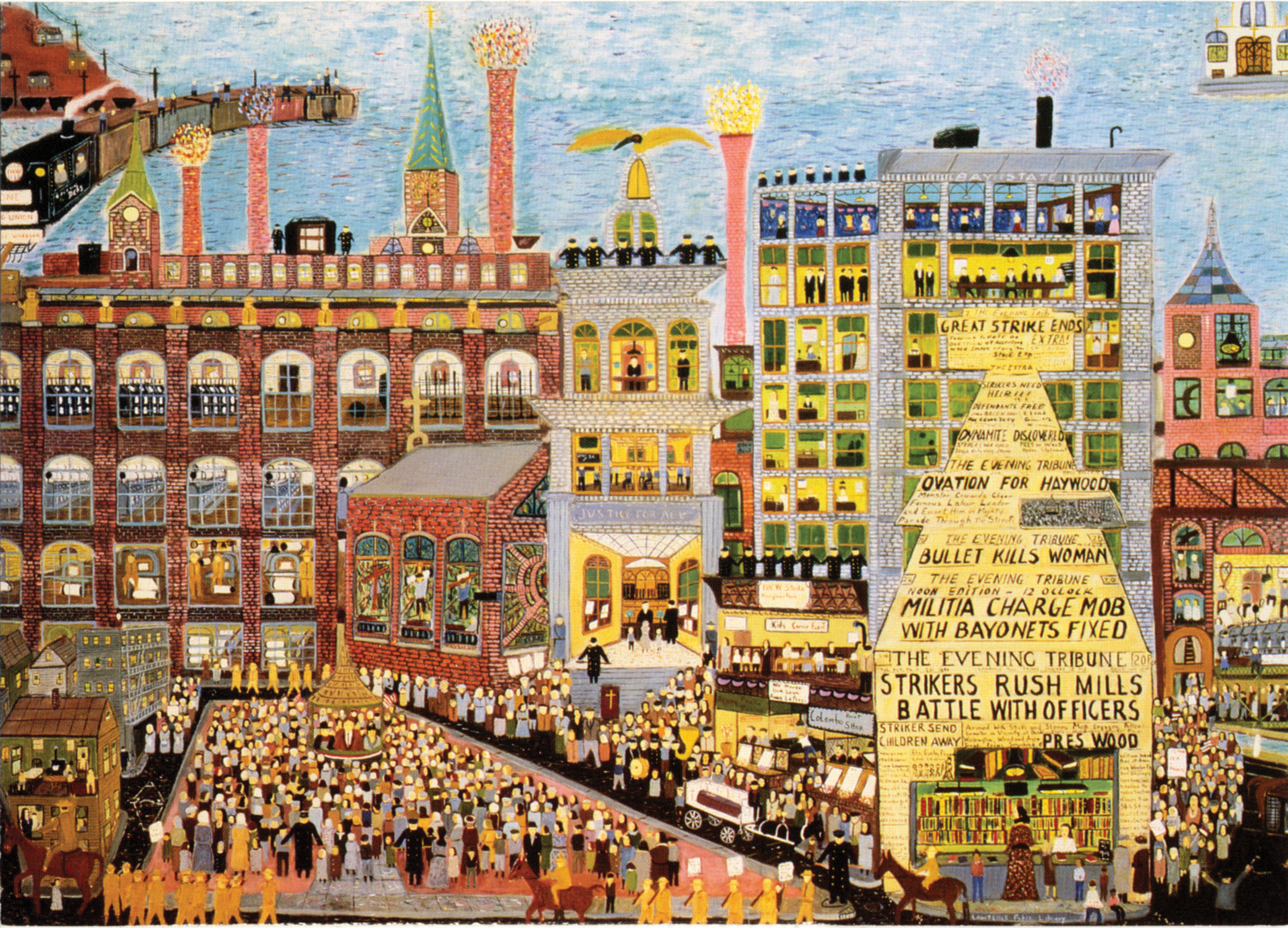 Despite the acclaim, Fasanella spent a few years living at a YMCA in Massachusetts while completing some of his most notable work, including several famous scenes of the 1912 “Bread and Roses” textile workers’ strike in Lawrence. He ultimately returned to New York, where for two decades he continued to portray urban settings and labor unrest. He died, in 1997, at age 83.