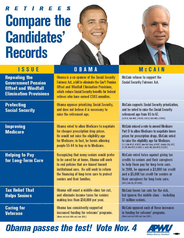 A flyer also has been mailed to APWU retirees, comparing the records of Sen. Obama and Sen. McCain on issues of importance to retirees and senior citizens.