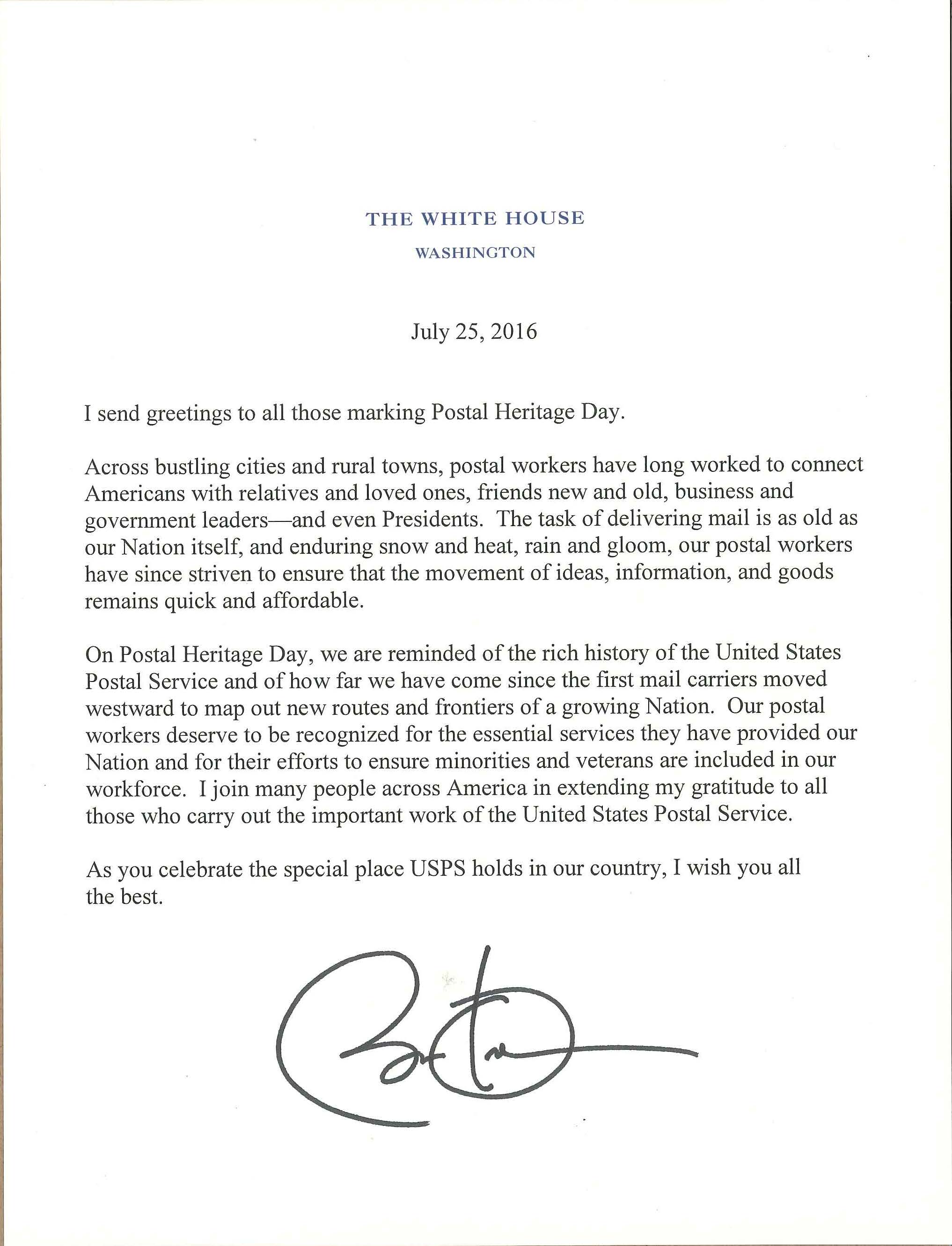 Obama wrote:“I send greetings to all those marking Postal Heritage Day.