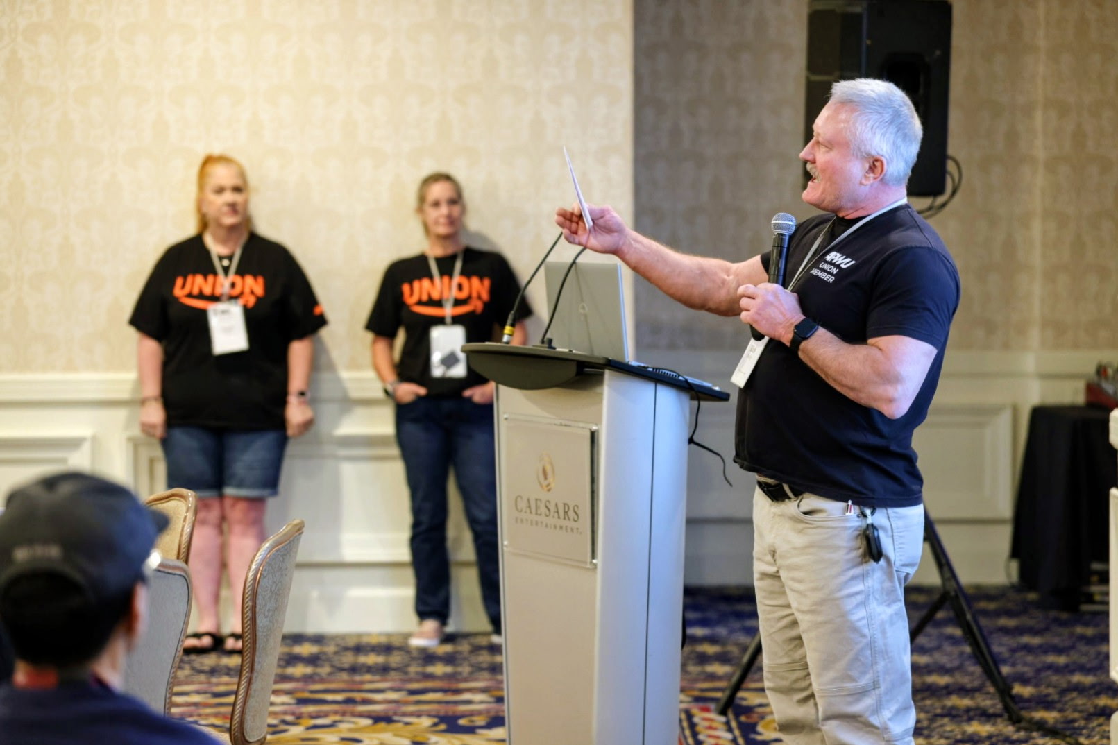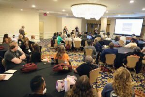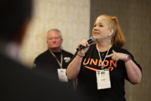 The support for private sector organizing was strong in the early hours of Day 2 of All Craft. Laurie Masterson was warmly welcomed in a room packed with attendees standing up to say they have her back and are ready to fight with her. Several members had asked to see how they could support her work or get started organizing Amazon workers in their local areas. Several members even took the microphone in the room just to say that they were ready to stand with her, because no matter who you work for, all workers are in a fight together against bad bosses and billionaires who want to exploit our work and profit off our labor.