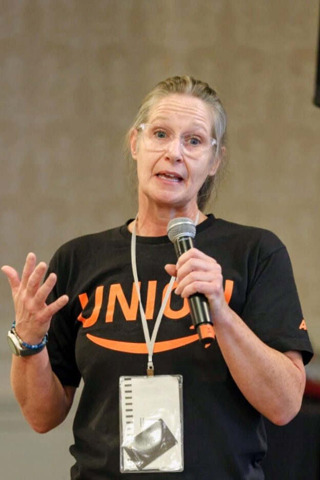 Masterson then spoke about her fight in Bellingham, where management has blanketed the facility in anti-union messages. They are directly attacking the APWU, saying we are a “government” union and don’t care about making lives better for Amazon workers, which, she countered, couldn’t be further from the truth. Laurie’s conclusion brought the room to a standing ovation:  the strength and solidarity that APWU is building to help organize Amazon workers makes winning a union there “inevitable.”