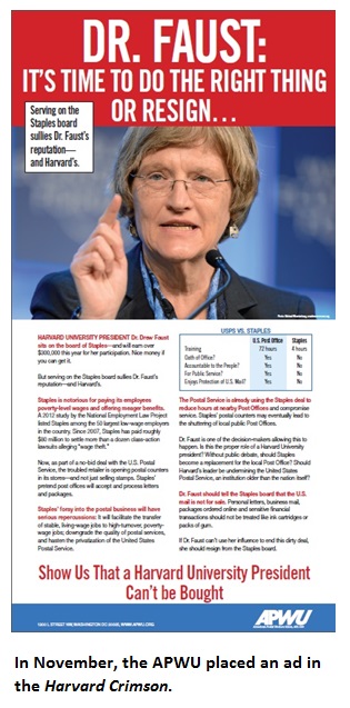 Following the students’ challenges to the program, the APWU placed an ad in the Harvard Crimson, the university’s student newspaper, calling on Faust to pressure the company to end its foray into the postal business or resign from the board.
