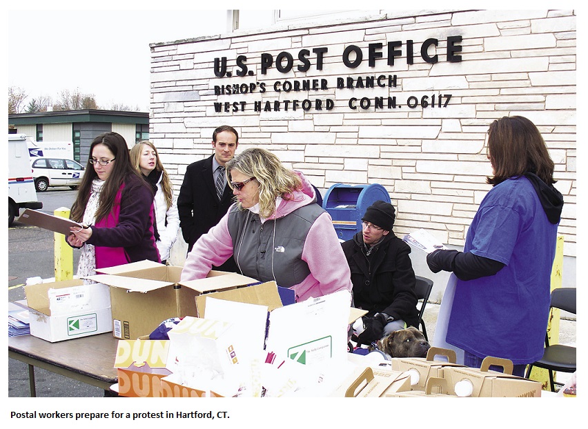 More than 50 people attended a protest organized by the Greater Hartford Area Local on Nov. 16 at a West Hartford Staples, including supporters from the National Postal Mail Handlers Union, the National Association of Letter Carriers, Hartford Federation of Teachers, and the United Food & Commercial Workers. Passing drivers honked and waved in support.