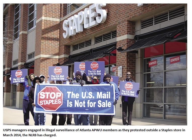 In early December, the National Labor Relations Board (NLRB) charged the Postal Service with engaging in illegal surveillance of employees while they protested at an Atlanta Staples store on March 4 and 9, 2014.
