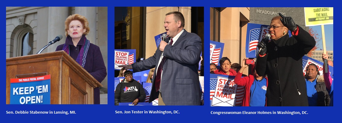 APWU members were joined by their sister postal unions, the National Association of Letter Carriers, the National Postal Mail Handlers Union, and the National Rural Letter Carriers Association at most of the events.