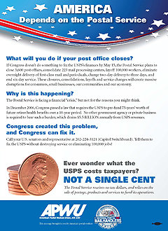 On Tuesday, April 17 (Tax Day), the APWU and the Mail Handlers Union are asking locals across the country to conduct informational leafleting at as many post offices as possible, with an emphasis on those facilities that draw media coverage on Tax Day. (Typically these are offices that have extended hours for tax day, but the timing of the leafleting is up to the local.) The purpose of this event is to bring to the attention of postal customers and the public at-large the drastic cuts that management is planning if Congress doesn’t act.Tax Day Informational LeafletingLocals are urged to bring members and community allies to the meeting. If there is a large contingent, the APWU is suggesting that members rally outside the senators’ office(s), while a delegation goes in to meet with the senator and his/her staff. This is not a protest against the senators. Members are urged to wear their T-shirts from last year’s Sept. 27 day of action and to distribute flyers to passers-by.