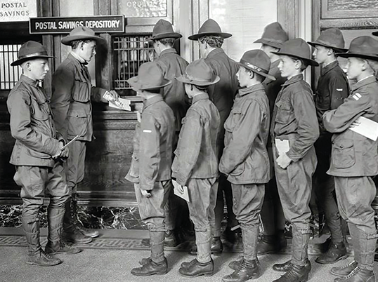 Boy scouts line up to make their first postal banking deposit in 1913.