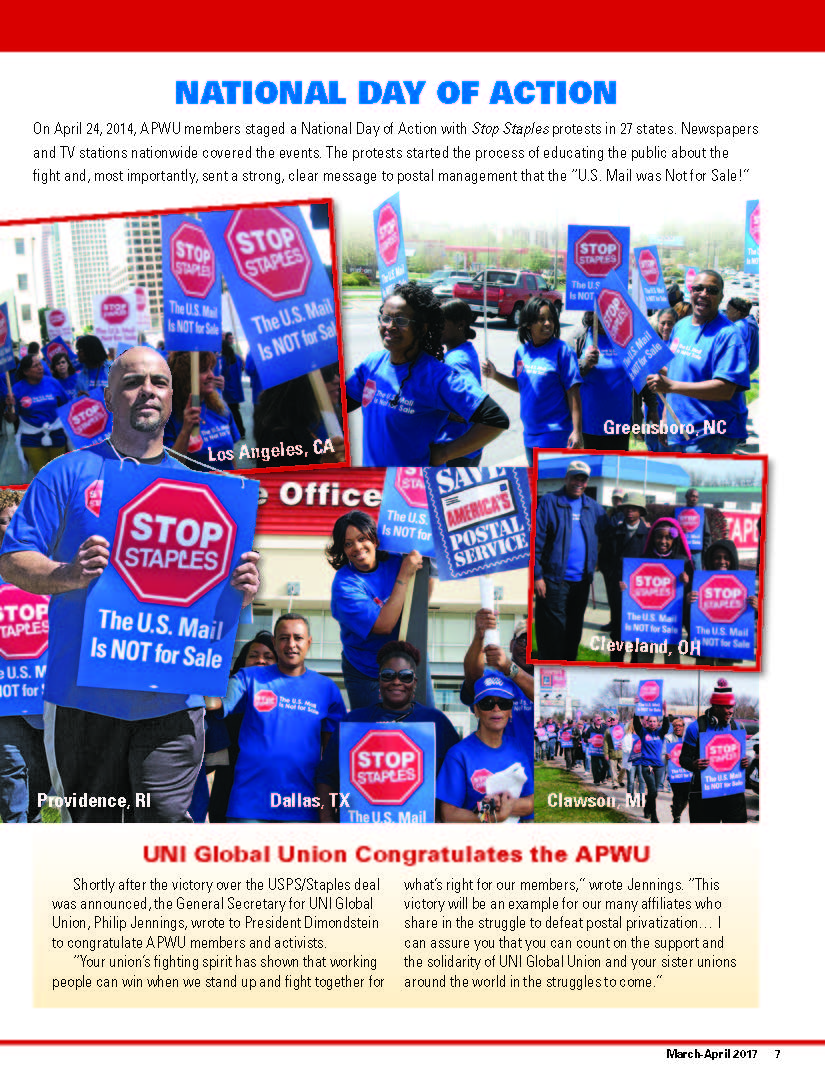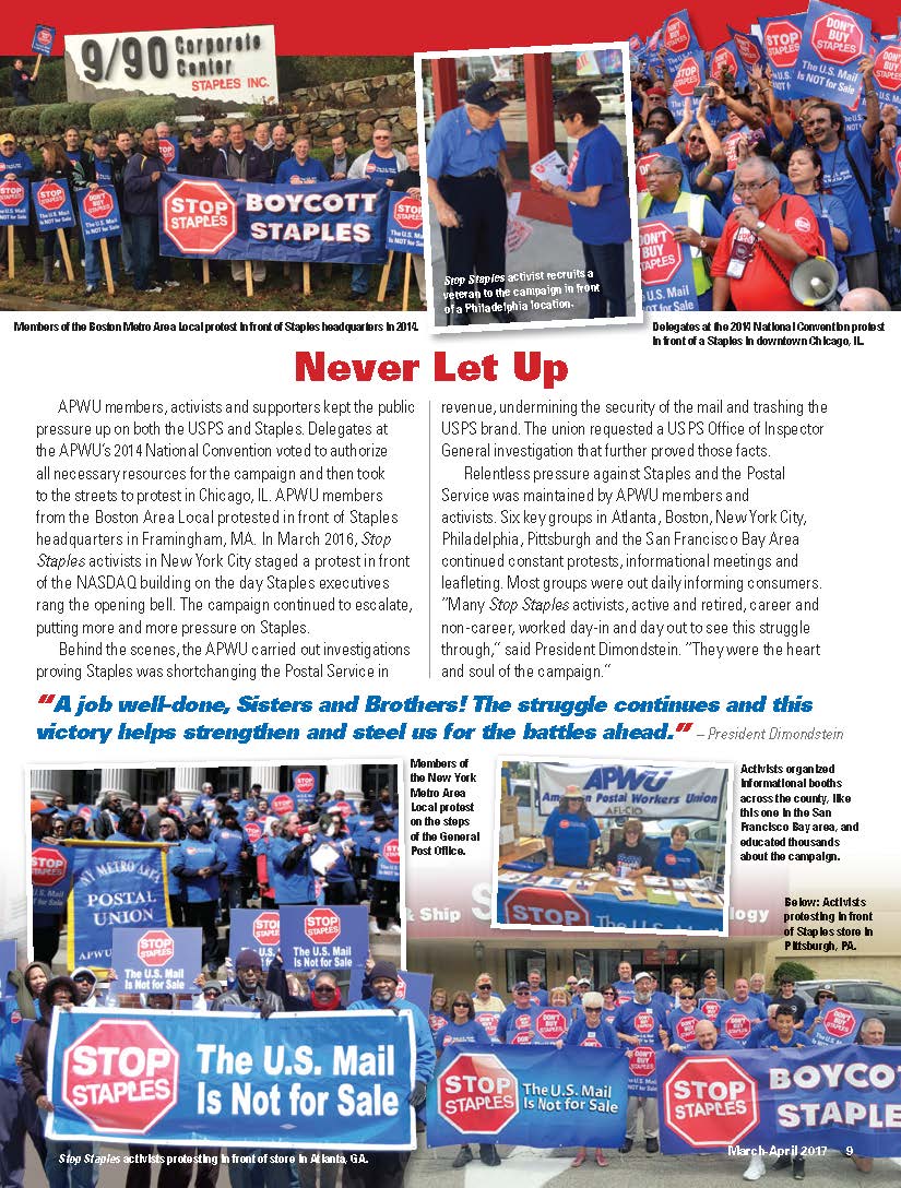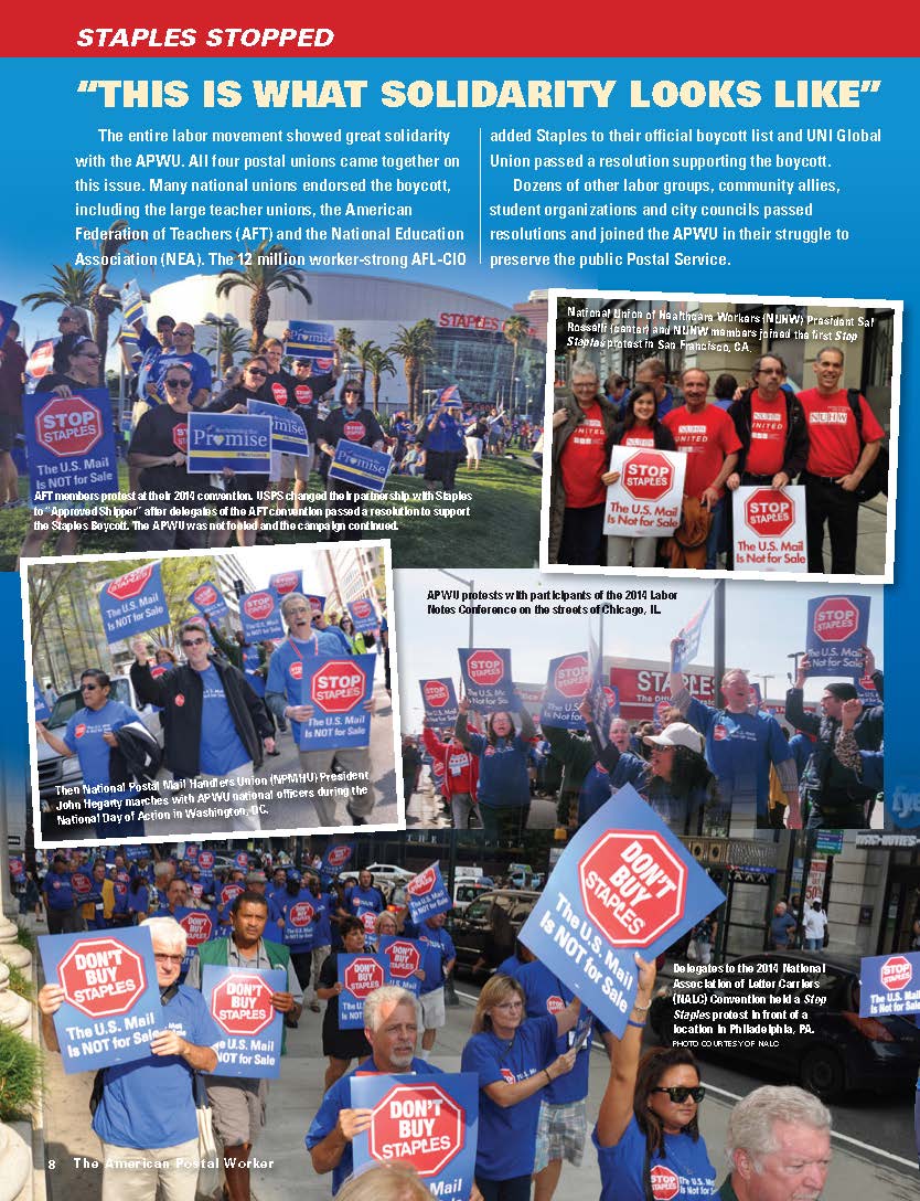 After three years, the Stop Staples campaign concludes with a huge victory. By the time this issue of the American Postal Worker is in mailboxes, the USPS will be out of all Staples stores nationwide. Gone are the Postal Service counters and signs in Staples stores, put in to take away good paying postal retail jobs from the dedicated members of the American Postal Workers Union (APWU).