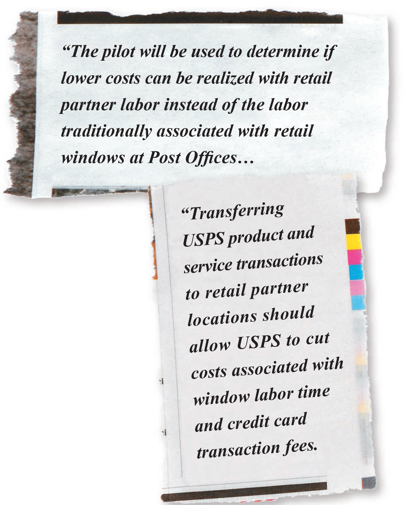At the NLRB hearing, USPS witness Brian Code testifi ed that USPS executives studied postal retail trends in Germany, Great Britain, Sweden, Australia, Canada and other countries, and used them as models for the program.