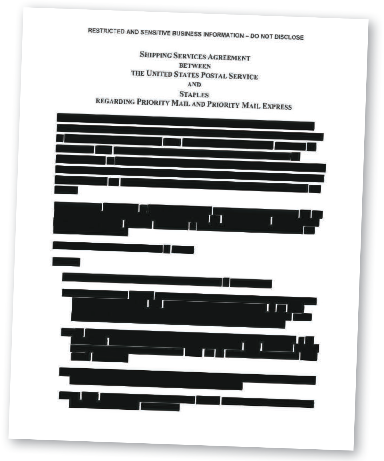 The 58-page agreement outlining the deal between the USPS and Staples should make customers think twice before turning over their mail to Staples. A heavily redacted version of the agreement between the USPS and Staples and testimony at an April 1, 2014, NLRB hearing reveal the following: