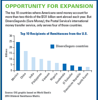 In 2014, more than $130 billion in remittances were sent from the United States to more than 140 countries. The USPS processed only 0.01% of those transactions, according to the USPS OIG. Of the ten countries receiving the most remittances from the United States (Mexico, China and India are the top three), the USPS wire service serves only four (and only one of the top five), see chart.